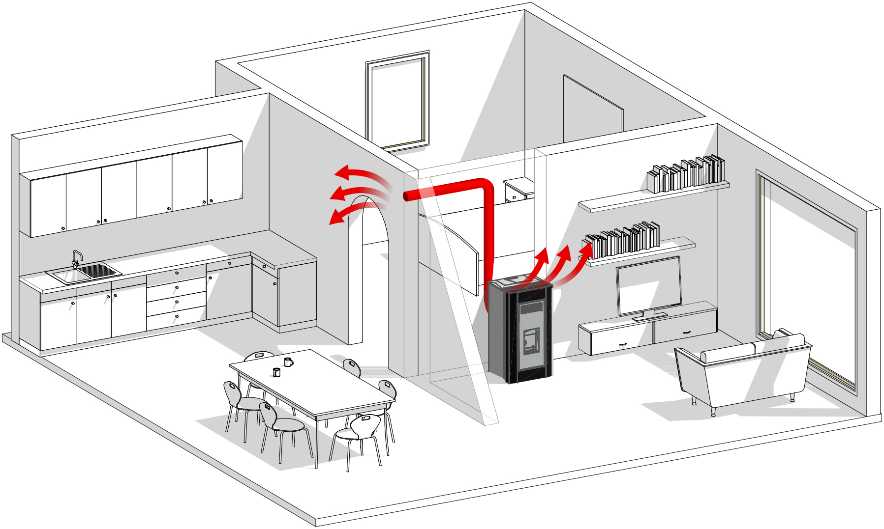 S dvojitým ventilátorom na odvod tepla do vzdialenosti až 5 metrov (prostredníctvom izolovanej rúrky) a vykurovanie miestností s objemom až 120 m3. Štandardne v modeloch: Zoe, Beatrice, Gemma, Ines, Evelyn, Rosa Canalizzata, Irma Plus, Vanessa Canalizzata, Rachele, Denise, Viola, Tommy Canalizzato, Andrea Canalizzato.